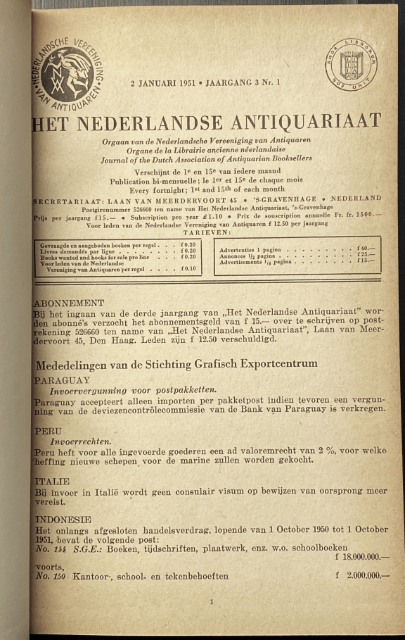 7. ANTIQUARIAAT, HET NEDERLANDSE Orgaan van de Nederlandsche Vereeniging van Antiquaren. Organe de la Librairie ancienne néerlandaise. Journal of the Dutch Assocation of Antiquarian Bookseller’s. 1950-1954 en 1960 (2e t/m 6e en 12e jaargang). Zes delen. Linnen.