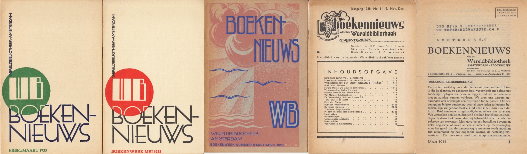 43. WERELDBIBLIOTHEEK WB-Boekennieuws (en) Boekennieuws van de Wereldbibliotheek. 53 nummers uit de jaren 1933-1945. Amsterdam, Wereldbibliotheek 1933-1945.