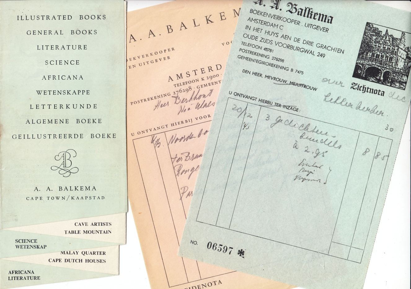 * Opvallende catalogus voor verschillende boeken (links op de foto), waaronder een van Cosmo de Bosdari en een van I.D. du Plessis. Bijgevoegd: acht rekeningen voor boeken, waarvan zes gesierd met een afbeelding van het Huys aan de Drie Grachten en twee in Van Krimpen-stijl, gezet uit de Spectrum. Nota’s voor uitgeverij Contact, voor Kees Lekkerkerker en voor ‘Heer Berkhout’.