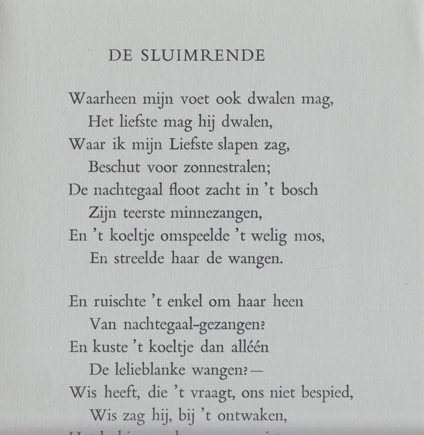 * Wat een mooi liefdesgedicht! ‘Waarheen mijn voet ook dwalen mag,/ Het liefste mag hij dwalen,/ Waar ik mijn Liefste slapen zag,/ Beschut voor zonnestralen’.