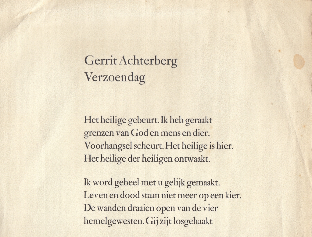 3. ACHTERBERG, Gerrit Verzoendag. (Amsterdam, Querido, 1972). Planodruk. 32,5 x 22 centimeter. Met de hand gezet en gedrukt [door Reinold Kuipers a.k.a. De Zondagsdrukker] in een oplage van 200 exemplaren. Wat gekreukt en met een vlekje.