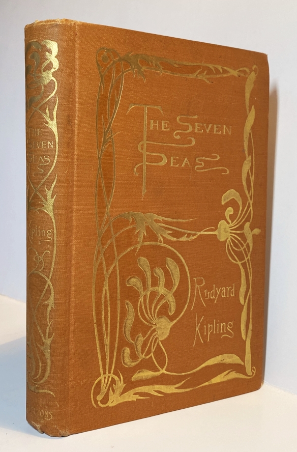22. GRAAG, Julie de Exlibris van Judith Zweerts. In: Rudyard KIPLING, The Seven Seas. New York, D. Appleton & Company, 1898. Oranjebruin linnen met rijke gouden versiering. (6), 210, (8) p. Kop verguld. Niet afgesneden. 1e Amerikaanse druk. Wat kleine kreukjes en feiltjes, maar een goed exemplaar met opmerkelijke jugendstilboekband.