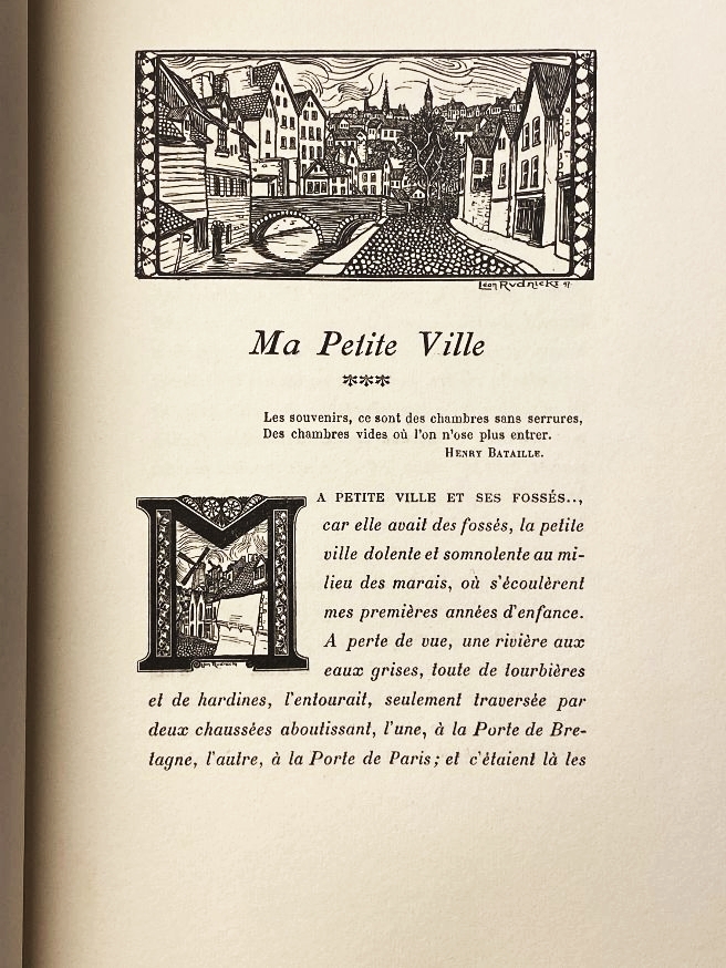 29. LORRAIN, Jean Ma petite ville. Le miracle de Bretagne. Un veuvage d’amour. Illustrations à l’aquarelle de Manuel Orazi, gravées à l’eau-forte par Frédéric Massé et imprimées sur couleurs. Vignettes décoratives de Léon Rudnicki. Paris, Société Française d’éditions d’art, L.-Henry May, éditeur, 1898. 25 x 18 cm. Halfmarokijn met brede hoeken (gesigneerd V. Champs). Rug rijk verguld. Originele, rijk vergulde omslag meegebonden in art nouveau-stijl (Léon Rudnicki): voorkant, achterkant en rug. (4), 52 p. Kop verguld. 6 kopergravures-aquatint door Frédéric Massé naar aquarellen van Manuel Orazi en vier vignetten naar dezelfde, alle tien met de hand gekleurd door M. Saudé. Plus 5 vignetten en een gedecoreerde initiaal M van Gedrukt in 300 genummerde exemplaren. 1e druk. Band licht verkleurd, aan de rugkant, dat is de enige feil.
