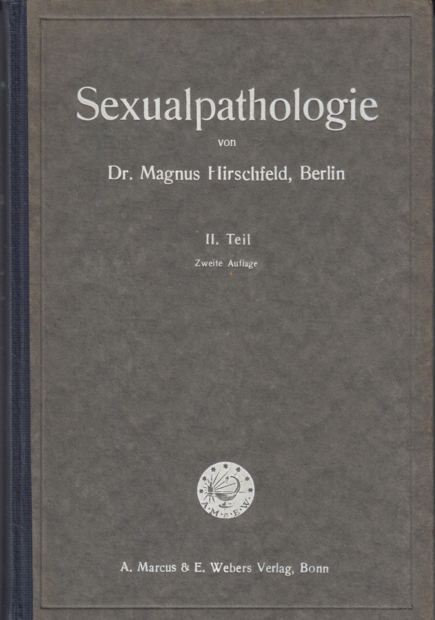 23. HIRSCHFELD, Magnus Sexualpathologie. Ein Lehrbuch für Ärzte und Studierende. (Three volumes). Bonn, Marcus & Weber, 1917. 25 x 17 cm. Compleet in drie delen. I: Geschlechtliche Entwicklungsstörungen mit besonderer Berücksichtigung der Onanie. II: Sexuelle Zwischenstufen. Das männliche Weib und der weibliche Mann. III: Störungen im Sexualstoffwechsel. Mit besonderer Berücksichtigung der Impotenz. 1917, 1918, 1920. Origineel halflinnen met opdruk in wit. XVI, 212; X, 288; XII, 344 p. Geïllustreerd. Met uitgeversadvertenties. 1e druk. De witte opdruk op de banden is wat versleten – verder mooie exemplaren zonder inscripties.