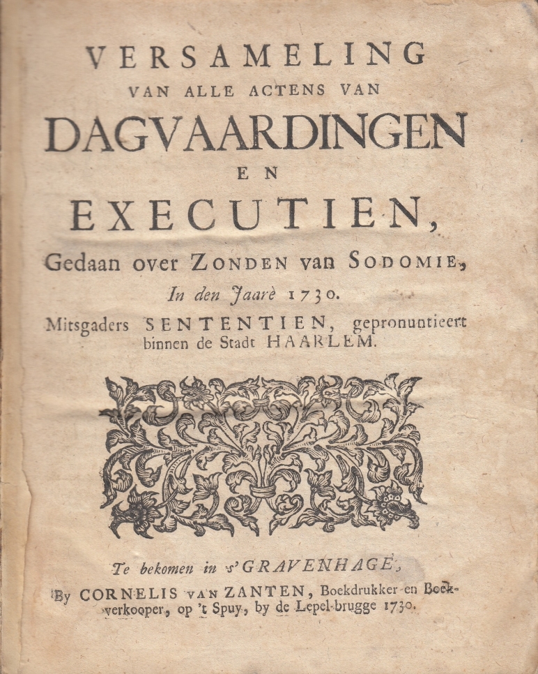 * Vroege publicatie over de sodomieprocessen in Nederland, niet alleen in Haarlem maar in veel andere Nederlandse steden. Bevat de teksten van de aanplakbiljetten, (‘Placcaat tegen het plegen vande Zodomitische Zonden’), vonnissen, gedichten en dagvaardingen van vluchtelingen. Niet de misdaden, maar de straffen worden uitvoerig besproken tot in de gruwelijkse details. Niet in Worldcat.