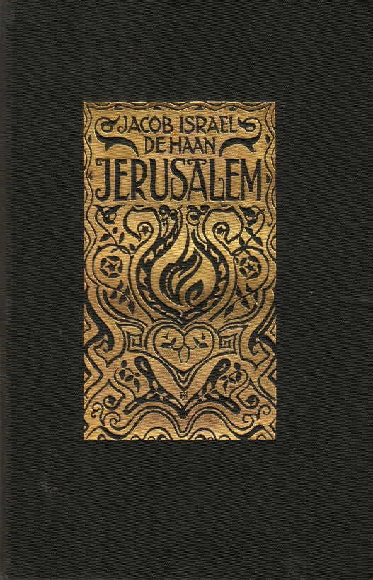 20. HAAN, Jacob Israël de Jerusalem. Amsterdam, Querido, 1921. Verguld groen linnen (ontwerp J.B. Heukelom). 128 p. Kop verguld. Gedrukt in paars en zwart. 1e druk. Vlekje voorop. Voorin staan de namen van eerdere eigenaars: C. Feirabend, N. van der Weert (1924) en Enno den Daas (1970)