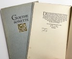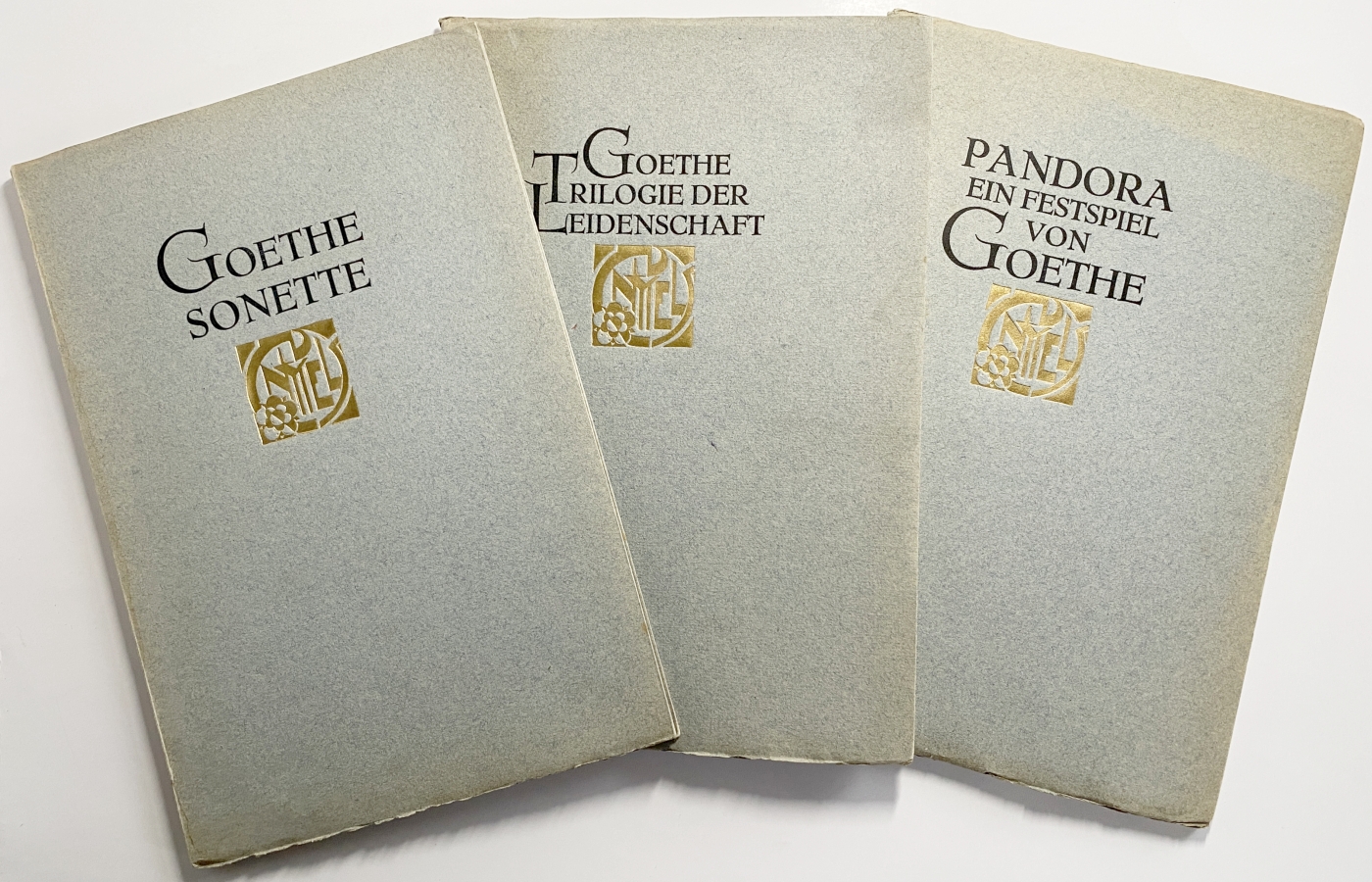 19. GOETHE, J.W. von Sonette, Trilogie der Leidenschaft & Pandora. (De drie Goethe-uitgaven van Charles Nypels, 1926-1929). Maastricht, Charles Nypels, 1926, 1927 & 1929. 25 x 17 cm. Uniform omslag met opdruk in goud en zwart. 40, 32, 56 p. Gezet uit de Grotius van S.H. de Roos en met door dezelfde getekende initialen, gedrukt op getint Ossekop-papier, elk in 120 genummerde exemplaren. Met inliggende prospectus bij het eerste boek, waarin een kort opstel is opgenomen door K. Kloss over de typograaf en drukker Charles Nypels (dit staat niet in het boek!). Alle drie exemplaren met enigzins verbruind/ gevlekt rugje, verder mooi.