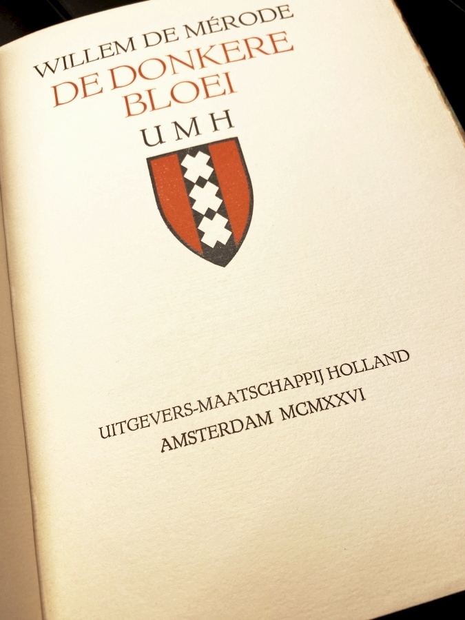 26. MÉRODE, Willem de De donkere bloei. (En:) De overgave. Amsterdam, Uitgevers-Maatschappij Holland, 1926. Twee uniform gebonden en genummerde boeken. Halfleer met hoeken en gemarmerde platten. 80; 104 p. Gezet uit de Erasmus Mediaeval, de titelpagina gedrukt in rood en zwart. 1e en 2e druk. Enkele kleine schaafplekjes. Beide met een handgeschreven nummertje voorin: 659 en 660.