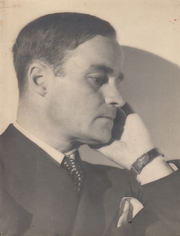 36. STORM, Stephen [= Faan NIJHOFF] Originele foto van A. Roland Holst. 22,4 x 17,1 cm. De schrijver zit naar rechts met ingekeerde blik. Zijn stropdas, horlogebandje en pochet wedijveren om aandacht met zijn gezicht en verzorgde kapsel. Aan de achterzijde een stempel ‘Photo–S.-Storm/ 216-Bd’Raspail,,Paris’ en een eigendomsplakkertje van Huib van Krimpen. Iemand schreef in rood ‘A. Roland Holst’ op de achterkant. Punaisegaatjes in de hoeken en enkele kleine vlekjes.