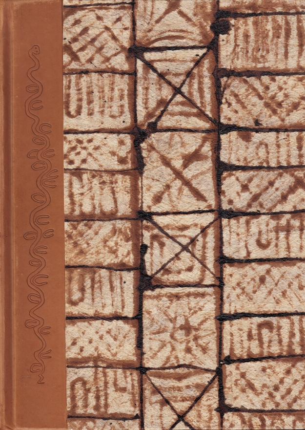 10. COOK, Captain James The Explorations of Captain James Cook in the Pacific as told by Selections of His Own Journals 1768-1779. Edited by A. Grenfell PRICE. Illustrated by Geoffrey E. INGLETON. New York, The Limited Editions Club, 1957. 30 x 21 cm. Half kangoeroe-leer (!) met aborigine versieringen. Gedecoreerde ruig-papieren platten. Met schuifhoes. XII, 298 p. Illustraties in roodbruin en zwart. Gedrukt in Adelaide (Australië) in 1500 genummerde exemplaren, alle gesigneerd door de illustrator Geoffrey Ingleton en door de typograaf, Douglas A. Dunstan. De schutbladen vertonen landkaarten (of eigenlijk zee-). Lichte beschadigingen op de rug in het zachte leer (zoals vaak) en op het foedraal.