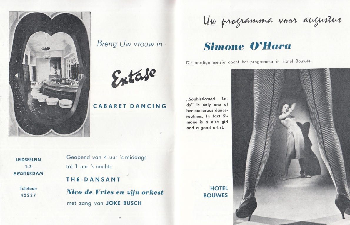* Catalogus van het amusement in vier ondernemingen van het concern van de nu vergeten hotelmagnaat Nico Bouwes: Hotel Bouwes te Zandvoort, Copacabana bij het Kurhaus te Scheveningen, Cabaret Club Extase aan het Leidseplein en 44 Club Femina aan het Rembrandtsplein. Met Simone O’Hara, Mickey Ung, het Trio Ramos, het Italiaanse orkest Stelio, Nico de Vries, de Violanty’s, de 2 Groschetti’s en nog veel meer. ‘Breng uw vrouw in Extase op de Thé Dansant’!