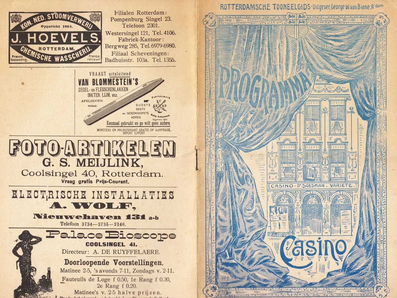 33. ROTTERDAM 1914 Programma Casino-Variété: Past d’r op! Hollandsche Revue in drie Acten met Zang en Dans van Henri ter Hall. Rotterdam, H. van Biene, [1914]. Geniet. 8 p. Met vele geïllustreerde advertenties. 1e druk. Horizontaal scheurtje, verder zeer gaaf.