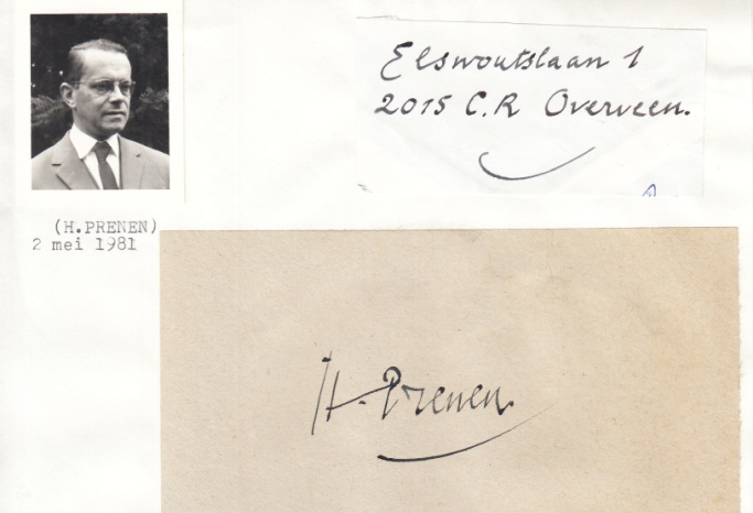 31. PRENEN, H.L. Handgeschreven, gesigneerde brief met fotootje aan een handtekeningenjager. Gekalligrafeerde brief op grijs papier, gedateerd ’26.IV.’81’. 21 x 14 cm. Samen met een portret in pasfotoformaat opgeplakt op een vel wit papier (26 x 18 cm), samen met het adres dat Prenen op de envelop had geschreven. Nette staat.