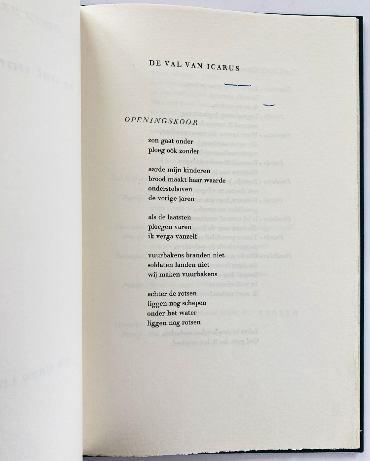 23. HERZBERG, Judith De val van Icarus. [Amsterdam], Sub Signo Libelli, 1983. Groen linnen (Binderij Phoenix). (24) p. Met de hand gezet uit de Walbaum en gedrukt door Ger Kleis in groen, blauw en zwart op Zerkall-Bütten Werkdruck in een oplage van 85 genummerde exemplaren. 1e druk.