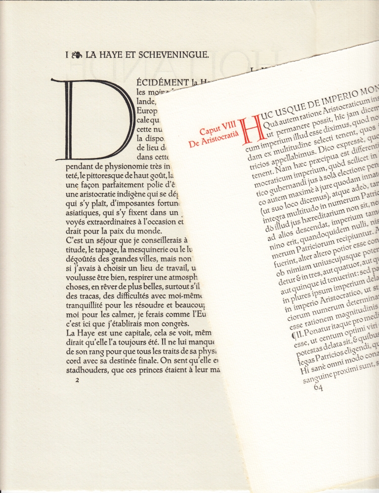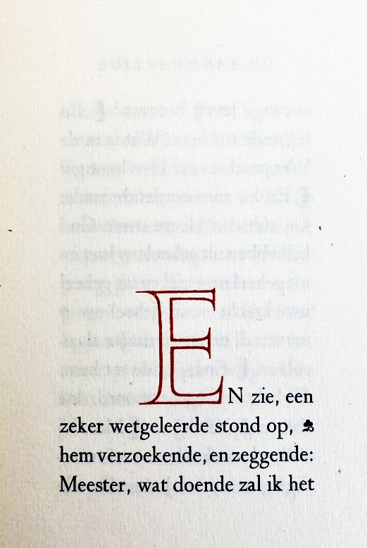 * Eerste toepassing (en veel zouden er in de twintigste eeuw niet volgen) van de Meidoorn-letter van De Roos in boekvorm door Duwaer, die de letter in 1935 had gekocht. Grote groene initiaal O van Sjoerd Hendrik de Roos. Met in het papier het watermerk van de Heuvelpers. Mooi!