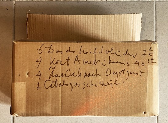 * Doos 16 van de twintig achter de schotten gevonden dozen uit het verloren gewaande archief van Jan Wolkers, zie onze catalogus 94: Jan Wolkers 100. Hierin zaten, volgens opschrift van Wolkers in viltstift, onder andere zes eerste drukken van De doodshoofdvlinder, vier 40e drukken van Kort Amerikaans en vier exemplaren van Zurück nach Oegstgeest.