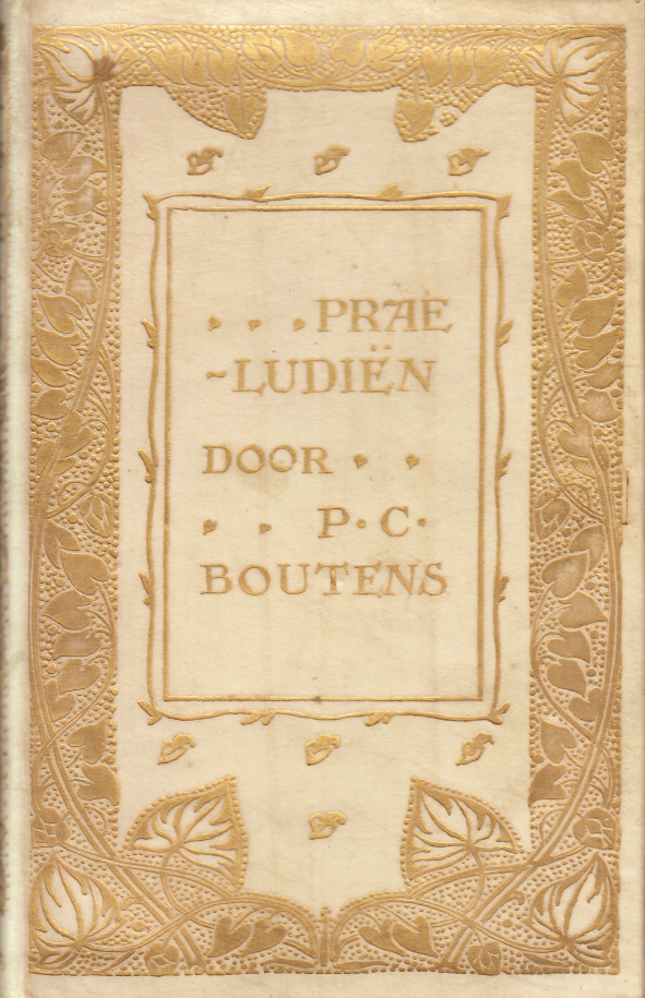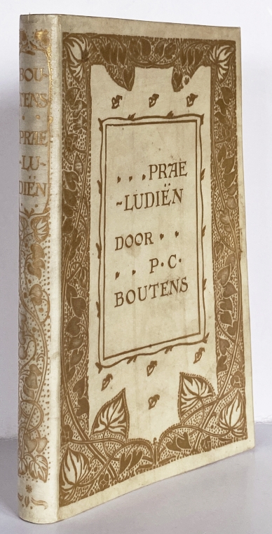 8. BOUTENS, P.C. Praeludiën. Den Haag, Maison Blok, 1902. Oorspronkelijk, rijk verguld soepel PERKAMENT. Kop verguld. (8), 132 p. Op Hollands. Blanco schutbladen. 1e druk. Zoals meestal ontbreken de lintjes. Klein vlekje linksboven op voorplat.