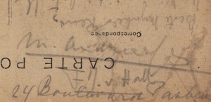 1. ANDRIESSEN, Mari, Frits van HALL & Kees KELK Handgeschreven ansichtkaart aan de schrijver J.K. RENSBURG. Ansichtkaart van La Sainte Chapelle te Parijs, met potlood beschreven door C.J. Kelk (9 regels) en gesigneerd door Kelk en de beeldhouwers M. Andriessen en F.J. van Hall. Geadresseerd aan ‘Monsieur/ J.K. Rensburg/ auteur/ “American” Hotel/ Leidsche plein/ Amsterdam’. Met adres in Parijs, waarschijnlijk een hotel. Niet gedateerd, en de Franse postzegels zijn niet afgestempeld. Vermoedelijk 1920 of 1930. De kaart is verbruind, maar helemaal leesbaar.