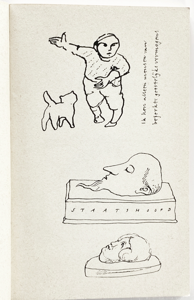 32. NOORDZIJ, Gerrit Originele tekeningen en handgeschreven tekst in een dummy. In: A. Alberts, Inleiding tot de kennis van de ambtenaar. Amsterdam, G.A. van Oorschot, 1985. De voorkant en de eerste 6 pagina’s zijn gedrukt, de rest van het omslag en binnenwerk zijn blanco. In het vooromslag is een blindstempel ‘Gerrit Noordzij’ aangebracht. Voorin het boek heeft Noordzij met fineliner 11 tekeningen gemaakt op 6 bladzijden, achterin ondersteboven zijn 13 pagina’s beschreven in het Nederlands en Engels, met enkele illustraties. Ca. 100 pagina’s blanco.