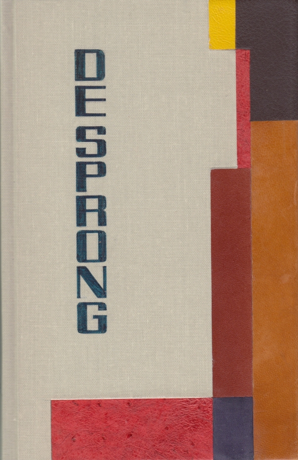 9. BROUWERS, Jeroen De sprong. Arnhem, Gelderse Culturele Raad, 1985. Unieke boekband van Pieter de Groot aan de voorkant versierd met verschillende reepjes kleur en kalligrafische belettering. Met etiketje van De Groot én door hem op het schutblad in potlood gesigneerd met datering ‘oktober 2002’. 82 p. 1e druk.