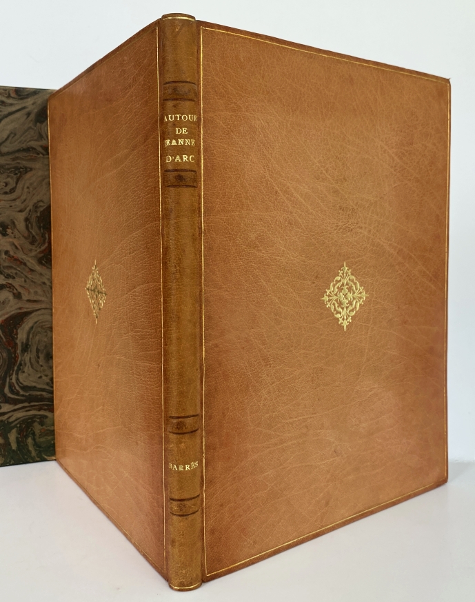 5. BARRÈS, Maurice Autour de Jeanne d’Arc. Parijs, Librairie Ancienne Édouard Champion, 1916. 26 x 20 cm. Heelleer met gemarmerd foedraal. 96 p. Gedrukt op geschept papier. Met facsimile van een brief van Barrès aan Champion. 1e druk. Foedraal iets gehavend maar het boek is in prachtige staat.