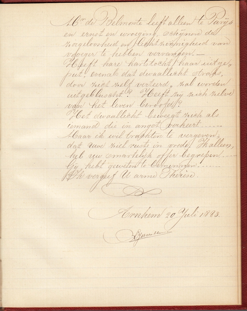 27. (MANUSCRIPT, 1883). HABBEMA, L.J.R. Thérèse. (Handgeschreven vertaling uit het Frans, 1883). In verguld rood linnen gebonden boek met opdruk ‘Thérèse’. 132 gelinieerde pagina’s, waarvan 122 in net inkthandschrift beschreven. Achteraan getekend ‘Arnhem, 20 Juli 1882, L.J.R. Habbema’. Zeer goede staat en uitstekend leesbaar.
