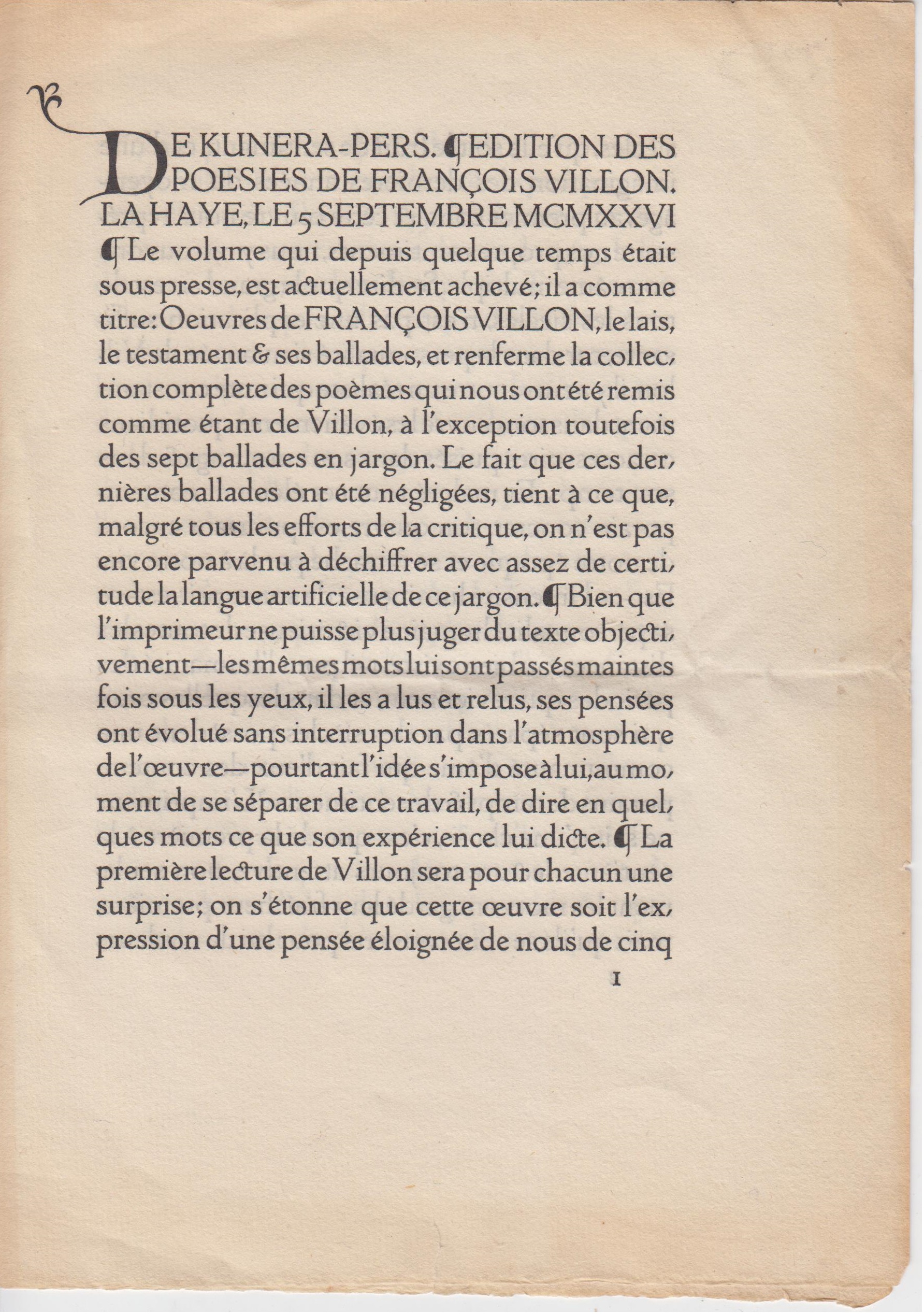 10. (KUNERA PERS). VILLON, François (Prospectus voor Oeuvres). (Den Haag, Kunera Pers, 1926). Vouwblad. Met de hand gezet en gedrukt door J.F. van Royen op zijn eigen pers. Gevouwen. Met twee stempeltjes van Scheltema & Holkema in rood.