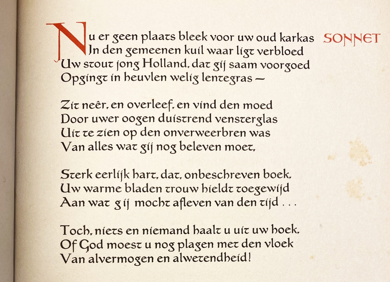 12. (KUNERA PERS). BOUTENS, P.C. In den keerkring. Zeven gedichten. (Den Haag, Nederlandsche Vereeniging voor Druk- en Boekkunst/ Kunera Pers), 1941 (= 1942). Verguld halfperkament. 28 p. Gezet uit de Disteltype van L. Pissarro en gedrukt in rood, blauw en zwart door J.F. van Royen op de handpers in een oplage van 210 genummerde exemplaren. 1e druk. Band aan bovenzijde (als meestal) verkleurd. Licht roestvlekkig (als meestal).