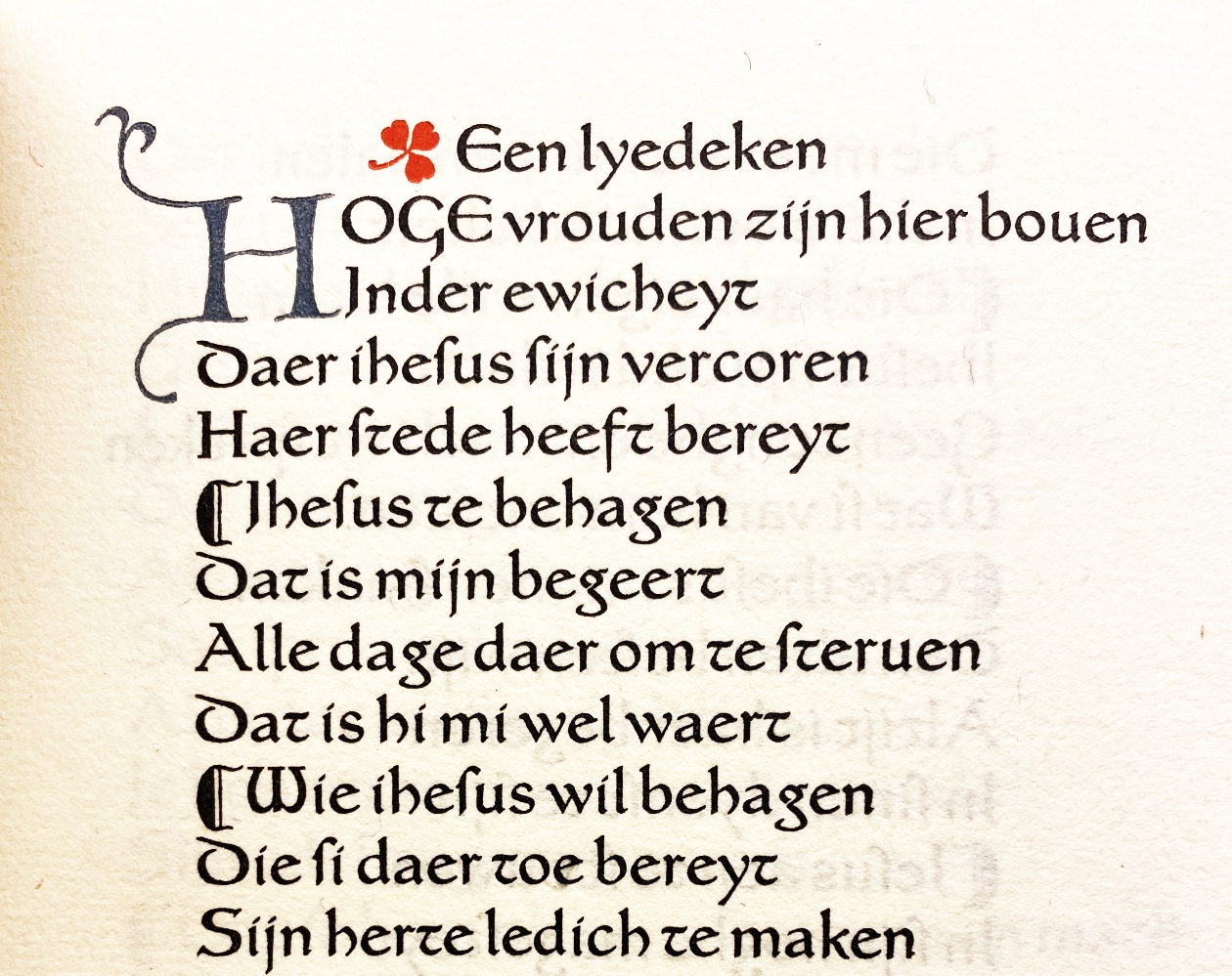 Een van de allermooiste Nederlandse private-pressuitgaven, geïnspireerd door de Doves Press van T.J. Cobden-Sanderson. Van Royen had Lucien Pissarro de opdracht gegeven om een speciale letter te ontwerpen voor zijn eigen privépers De Zilverdistel. De opvallende vervlochten initialen werden door Van Royen getekend en door hemzelf in buxushout gesneden. In druk gedateerd: 20 april 1929.