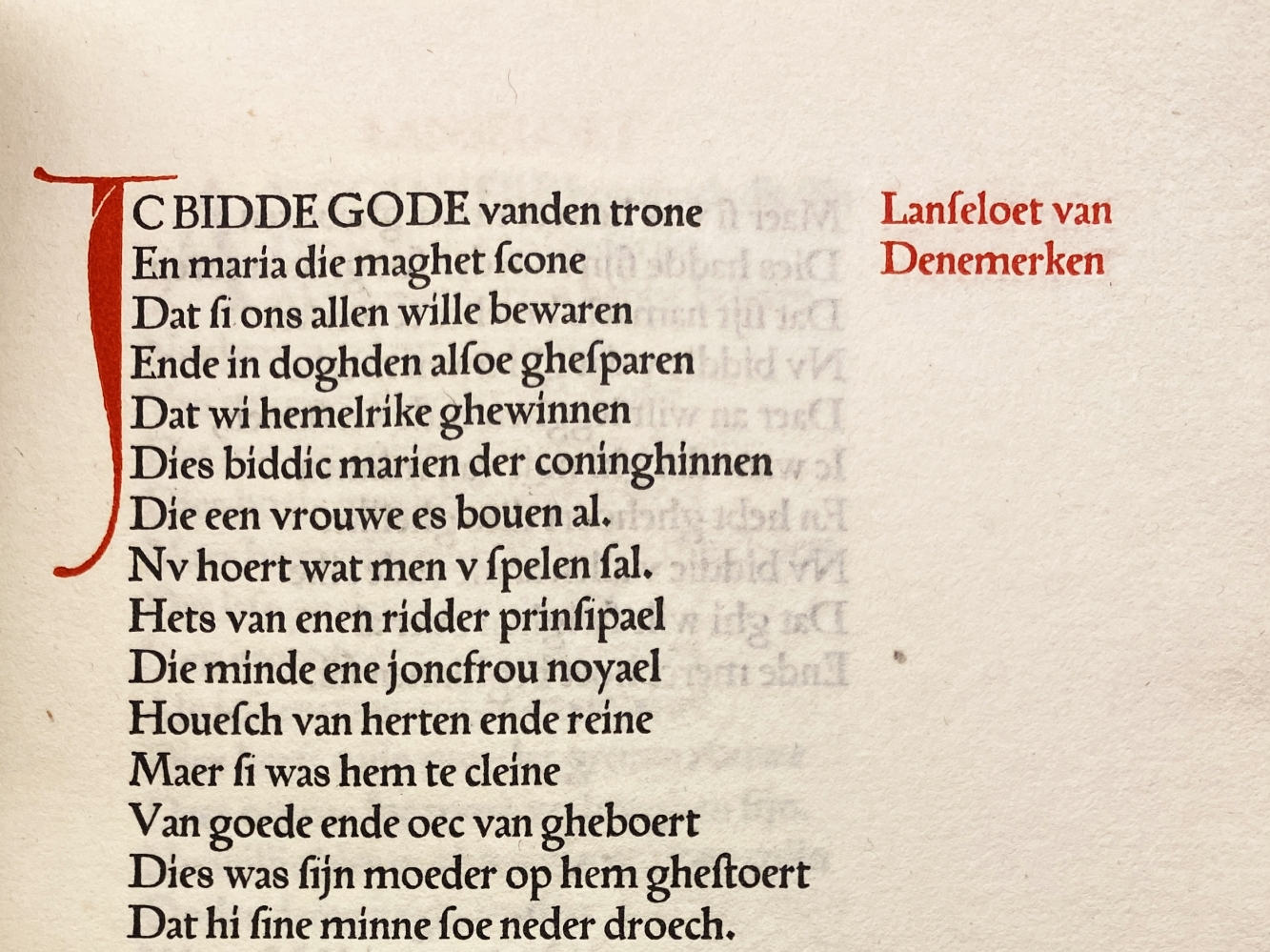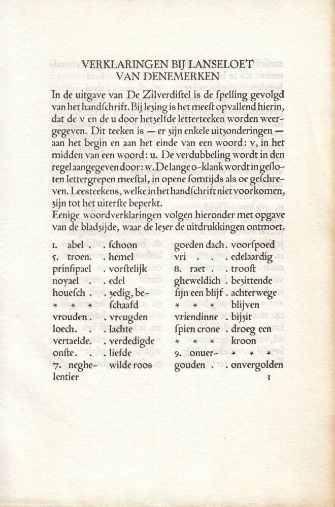 2. (ZILVERDISTEL). LANSELOET VAN DENEMERKEN Een abel spel van Lanseloet van Denemerken hoe hi wert minnende ene joncfrou die met sijnder moeder diende. (Den Haag, De Zilverdistel, 1913). Oorspronkelijk perkament met vergulde rugbelettering en verguld Zilverdistel-vignet op voorplat. Met de hand gezet en gedrukt door J.F. van Royen op de handpers van Enschedé in rood en zwart in een oplage van 100 exemplaren. Met, los bijgevoegd, de ‘verklaringen bij Lanseloet van Denemerken’ (4 p.), ofwel vertalingen van middeleeuwse woorden. Het perkament staat een beetje wijd.