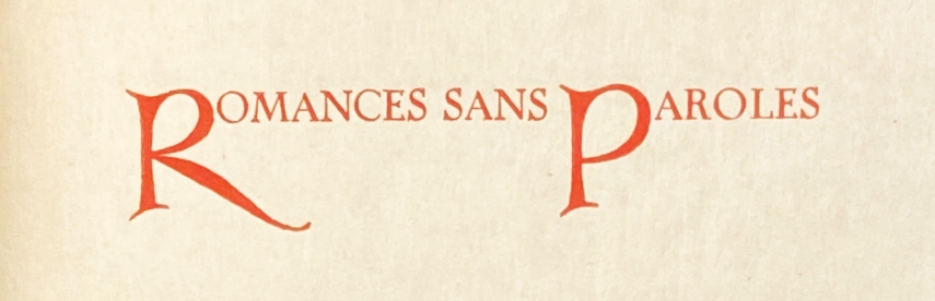 1. (ZILVERDISTEL). VERLAINE, Paul Romances sans paroles. (Den Haag, De Zilverdistel, 1913 [= 1914]). Ingenaaid met stofomslag en gedrukt etiketje met schrijver en titel. (4), 52 p. Gezet uit een letter van Peter Schoeffer van Gernsheim en gedrukt op de handpers van Joh. Enschedé en Zonen te Haarlem in rood, blauw en zwart op Keizerlijk Japans papier in een oplage van 130 genummerde exemplaren. Rond rug zeer licht verbruind, nummer onder het colofon weggegumd.
