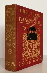 16. DOYLE, Arthur Conan The Hound of the Baskervilles. Another Adventure of Sherlock Holmes. Londen, George Newnes, 1902. Versierd linnen. (6), 360 p. 1e druk. Rug verbleekt. Franse titel ontbreekt, donkere plakresten van verwijderde kaft op binnenzijde platten.