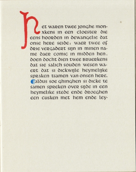 * Middeleeuwse legende. Dit is een van 25 exemplaren op blauwgrijs papier van Guérimand. Vroege SSL-uitgave, nog vol experimenten: de initiaal H, die in rood werd gedrukt, is door drukker Ger Kleis zelf in linoleum gesneden, en de versiering aan het eind van de Legende werd door hem in blauwe inkt omkringeld. Breugelmans 15.