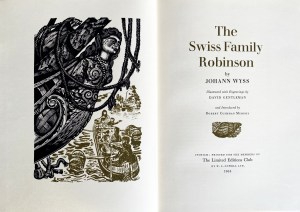Inliggend de Monthly Letter of the Limited Editions Club nr. 350 met een uitvoerige inleiding op de tekst van deze klassieke Robinsonade, gedetailleerde informatie over illustrator David Gentleman (geb. 1930), met Sem Hartz, Jan van Krimpen, Reynolds Stone en vier andere medewerkers van de Club een van degenen die ook postzegels hebben ontworpen. Gezet uit de Monotype Bodoni en (de hoofdstuktitels) de 24-punts Walbaum, met de hand gezet door Will Carter (1912-2001) van The Rampant Lions Press.