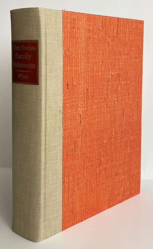 45. WYSS, Johann The Swiss Family Robinson. Illustrated with Engravings by David Gentleman and introduced by Robert Cushman Murphy. Ipswich, The Limited Editions Club, 1963. 27 x 20 cm. Twee kleuren textiel (grijs buckram met platten van oranje Pacifische kamperfoelie-grasscloth), in met papier beklede stevige kartonnen schuifhoes. XVI, 356 p. Met 31 originele tweekleurige houtgravures plus kleine vignetten in zwartwit. Gedrukt in 1500 genummerde exemplaren, alle gesigneerd door Gentleman. Foedraal iets verkleurd, maar het boek is in perfecte conditie.