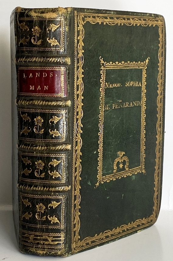 * Voorop in goudstempel, dansend in een sierkader ‘Mejouff. Sophia de Peñaranda’, achterop ‘Eersten Prijs 1805’. Sophia (1792-1850) stamde uit het Westvlaams adellijk geslacht De Peñaranda de Franchimont, zij behoorde tot de hoogste kringen. Sophia trouwde in 1818 met Pierre Van der Beke de Cringen (1792-1871) – hij was de laatste van zijn roemrijk geslacht, dus zij kregen geen kinderen.