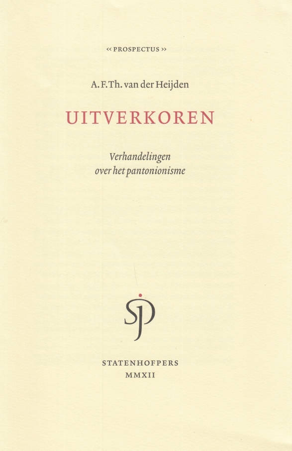 15. HEIJDEN, A.F.Th. van der Uitverkoren. Verhandelingen over het pantonionisme. (Den Haag), Statenhofpers, 2012. Verzilverd linnen (Boekbinderij van Waarden; het bandstempel werd speciaal voor deze uitgave ontworpen door Peter Muller). 176 p. Gezet uit de Lexicon 2 van Bram de Does en gedrukt door Jan de Jong op 145 grams Zerkall Bütten Elfenbein in een oplage van 176 door de auteur genummerde en gesigneerde exemplaren. 1e druk.