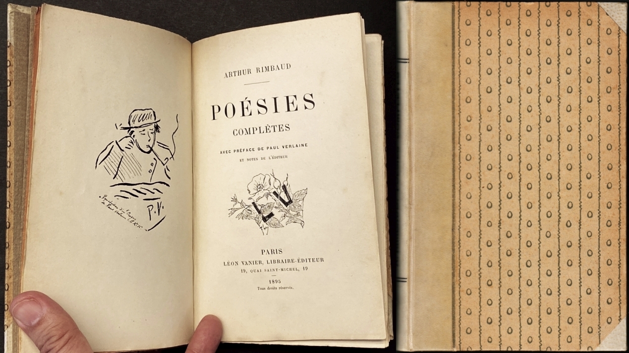 32. RIMBAUD, Arthur Poésies complètes. Avec préface de Paul Verlaine et notes de l’éditeur. (1895). Paris, Léon Vanier, 1895. Later halfperkament; voorzijde origineel omslag meegebonden, voorzien van een exlibris van Eduard Grisebach, dat vervaardigd is in Parijs, 1881. XXIV, 136 p. Deels eerste druk.