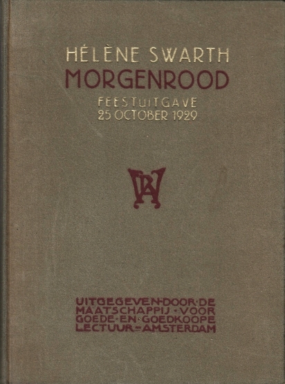 37. SWARTH, Hélène Morgenrood. Feestuitgave in beperkte oplaag 25 October 1929. Amsterdam-Sloterdijk, Wereldbibliotheek, 1929. Grijs fluweel met bestempeling in donkerrood en goud. Kop verguld. 140 p. Gedrukt in blauw en zwart in een beperkte, genummerde oplage. 1e druk. Rugje wat vervaagd. Mooi exlibris van H. Boekenoogen in lithografie van Aart van Dobbenburgh.