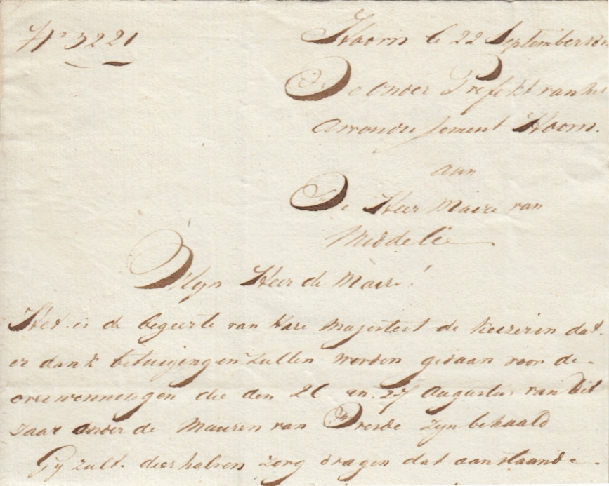 33. SLAG BIJ DRESDEN, 1812 Handgeschreven brief van de Onderprefect van het arondissement Hoorn aan de burgemeester van Middelie, gedateerd ‘Hoorn te 22 September 1813’. Gevouwen blad, grootst formaat 31 x 20 cm. Vouwbrief met o.a. stempels ‘Hoorn’. Handschrift als een vloot met volle zeilen, maar goed leesbaar. Gericht aan ‘De Heer Maire van Middelie’ en ondertekend met ‘UED Dienaar EJR Mollerus’. 48 regels. Het zegel is afgescheurd (om de brief te openen). Verder zeer gaaf.