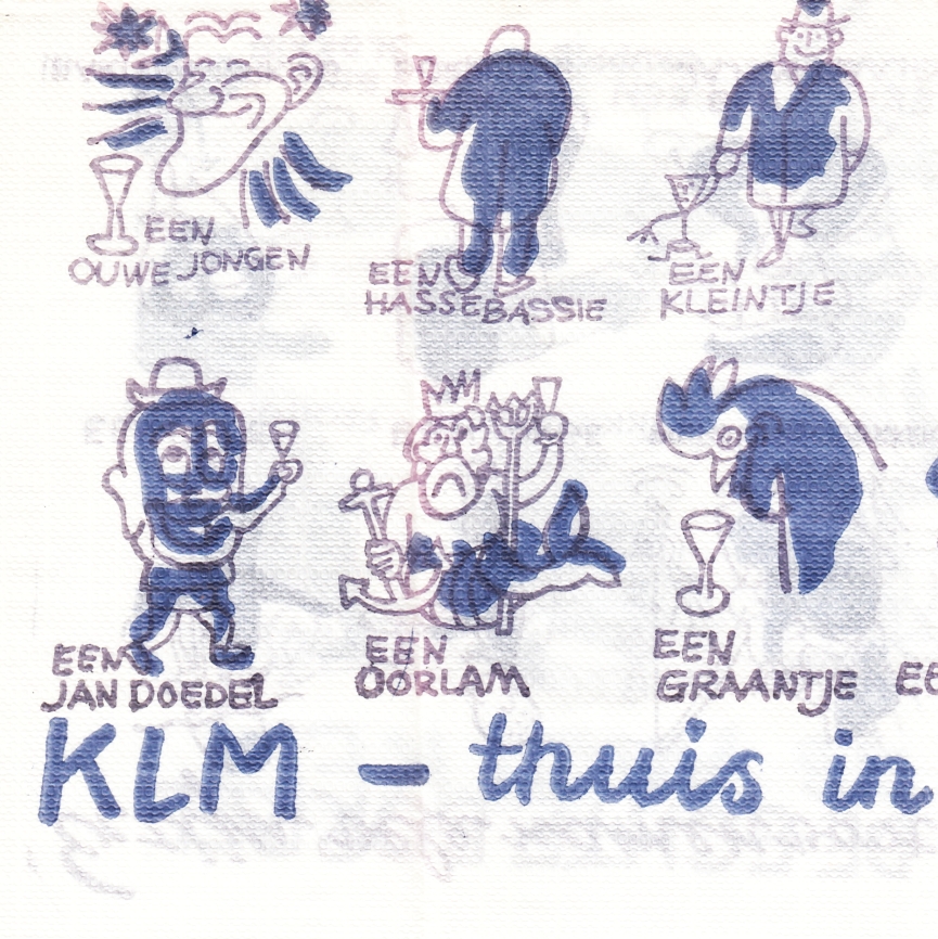 18. KLM KLM – thuis in de wolken. (Gevouwen vliegtuigplacemat). KLM, jaren 1960? Placematpapier (44 x 35 cm) in achten gevouwen. Bedrukt in paars en blauw met 24 getekende grapjes over de benamingen van jenever.