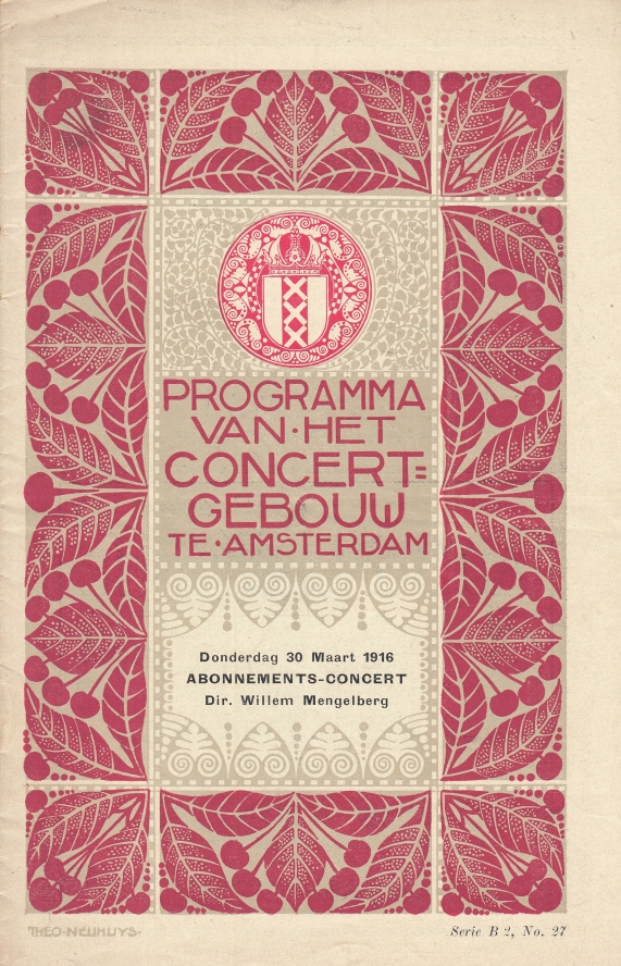 25. NEUHUYS, Theo Programma van het Concertgebouw Amsterdam. Abonnements-concert 30 Maart 1916. Dirigent Willem Mengelberg. [Amsterdam, Concertgebouw], 1921. Origineel omslag in rood en grijs (ontwerp Theo Neuhuys). (16) p. incl. omslag. Fraai getekende advertenties. Netjes.