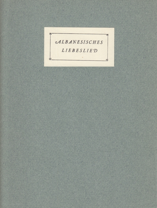 36. SUB SIGNO LIBELLI Albanesisches Liebeslied aus Premet. [Amsterdam], Sub Signo Libelli, 1976. Genaaid met omslag. 16 p. Gezet uit de Astrée en gedrukt op een Boston handdegelpers in 40 genummerde exemplaren. Mooi exemplaar.