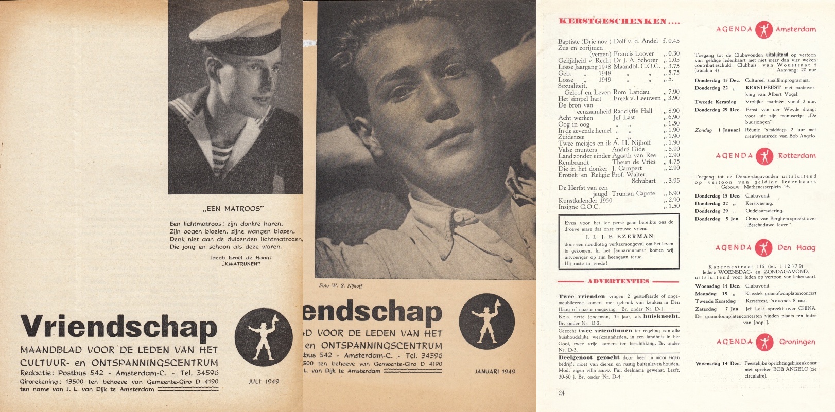 41. VRIENDSCHAP Vriendschap. Maandblad voor de leden van het Cultuur- en Ontspanningscentrum. Jaargang 1949, compleet in 11 nummers. Amsterdam, C.O.C., 1949. 27 x 20 cm. Amsterdam, C.O.C., 1949. 27 x 20 cm. Elf maandelijkse afleveringen: augustus-september is een dubbelnummer. Alle nummers tellen 16 p. elk, maar augustus-september telt 28 pagina’s en het traditioneel luxere kerstnummer 24 pagina’s. Geïllustreerd met tekeningen en foto’s.1e druk. Nr. 1 met weggewit eigenaarsstempel. Van nr. 11 zijn de laatste twee bladen gekreukt. Verder in zeer goede staat.