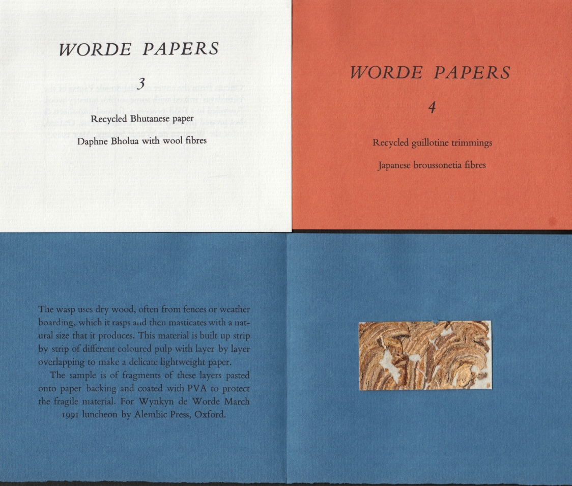 44. WYNKYN DE WORDE SOCIETY Worde papers. Samples of special makings of papers for members of the Wynkyn de Worde Society. Oxford, Alembic Press, 1989. Enveloppe van rood geschept papier waarin vijf vouwblaadjes (10 x 12 cm) met monsters van bijzondere papiersoorten. Met toelichting op elk vouwblad. Gaaf.
