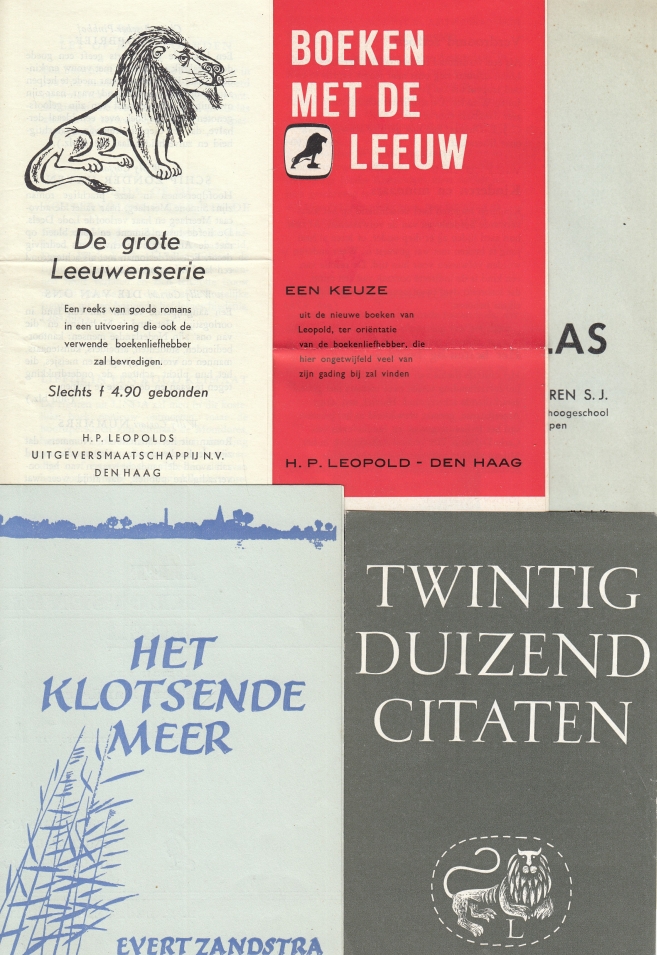 21. LEOPOLD, H.P. (Uitgeverij) Collectie prospectussen. Ca. 1935 – 1955. Ruim 30 grotere en kleinere folders en veertien boekkaarten. Vele zijn in pen gedateerd door Kees Lekkerkerker.