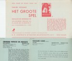 * Uitgeversreclame van uitgeverij Leopold, allemaal voor speciale titels en series. Deels encyclopedieën en andere naslagwerken, deels romans, jeugdboeken en wetenschappelijke boeken, b.v. Denkend mensch en menigte van Kurt Baschwitz, de biografie van Marie Curie door haar dochter en Het groote spel van Tarjei Vesaas. De blauwe boekkaarten zijn aankondigingen. Zie nr. 9 van deze nieuwsbrief voor de oprichting van Uitgeversmaatschappij H.P. Leopold. In 1937 overleed oprichter Johannes ‘Joes’ Leopold, en zijn zoon en mededirecteur Robbert Leopold pleegde zelfmoord in mei 1940.