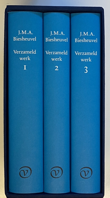 2. BIESHEUVEL, J.M.A. Verzameld werk. Amsterdam, Van Oorschot, [2008]. Drie delen. Linnen met leeslinten en stofomslagen in linnen cassette (ontwerp Gerrit Noordzij). 996; 744; 852 p. 1e druk. Cassette wat stoffig.