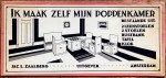 42. ZAALBERG, Jac.L. Bouwplaat voor kinderen. 2. Ik maak zelf mijn poppenkamer bestaande uit: 2 leunstoelen, 2 stoelen, rustbank, tafel, klok. Amsterdam, Jac.L. Zaalberg, (begin jaren 30). Oblong 24 x 51 cm. Omslag van lichtrood papier, gevouwen om een blad karton en een blad stevig papier voorbedrukt met meubels om uit te knippen. Wat scheurtjes in de rand van het omslag, maar in goede staat. Boekhandelsmerkje van het Huis voor Handenarbeid J. Pranger in Arnhem.