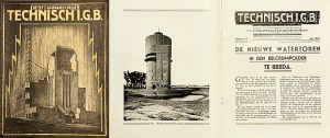 * “The new water tower in the Belcrumpolder in Breda”. Amazing technical magazine about utility construction with a large, gold-accentuated print of “the cathedral” by Radio Kootwijk on the front and remarkable, large photos, throughout the issue, of the modernist water tower under construction and after completion. This rre magazine appeared irregularly from 1926 until the 1950s, initially always with the same monumental cover illustration (done in offset).